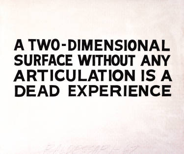 バルデッサリが「絵画とは何か」を問うために制作したテキスト絵画です。美術評論やハウツー本に出てくるフレーズをそのままキャンバスに文字として描き、しかも商業サインペインターに外注することで、「キャンバス+絵具」という絵画の形式だけを残しつつ、中身を純粋な言語に置き換えています。その結果、「何の工夫もない平らな面は、体験としては死んでいる」と宣言する言葉自体が絵画となることで、「ではこれは本当に“生きた”絵画なのか?」「何が作品をアートたらしめるのか?」という自己矛盾的な問いを生み出す構造になっています。コンセプチュアル・アートの初期を代表し、のちのアプロプリエーション的な実践の先駆としても位置づけられています。