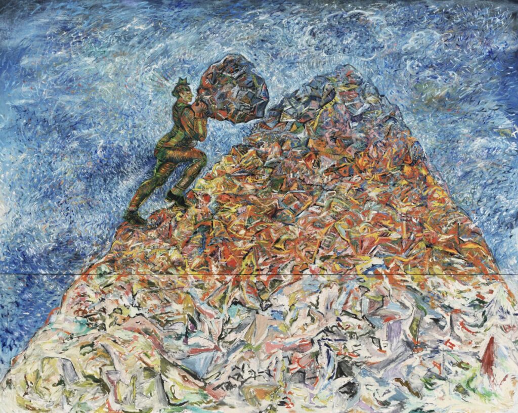 アンゼルム・キーファーは、藁や鉛、土などの重い素材と、焼け跡のような荒れた風景を組み合わせることで、作品そのものを戦後ドイツの記憶を刻む歴史資料のように作り上げた画家です。 荒野の地平線や灰色の空の中には歴史的な言葉や地名が書き込まれ、鑑賞者は一枚の絵を前にしながら、風景とドイツの近現代史のあいだを行き来しつつ、ナチズムやホロコーストの記憶と向き合うことになります