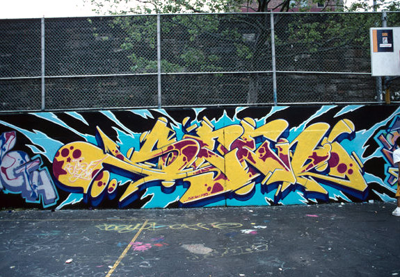 Section of Haring's mural covered by graffiti and street art